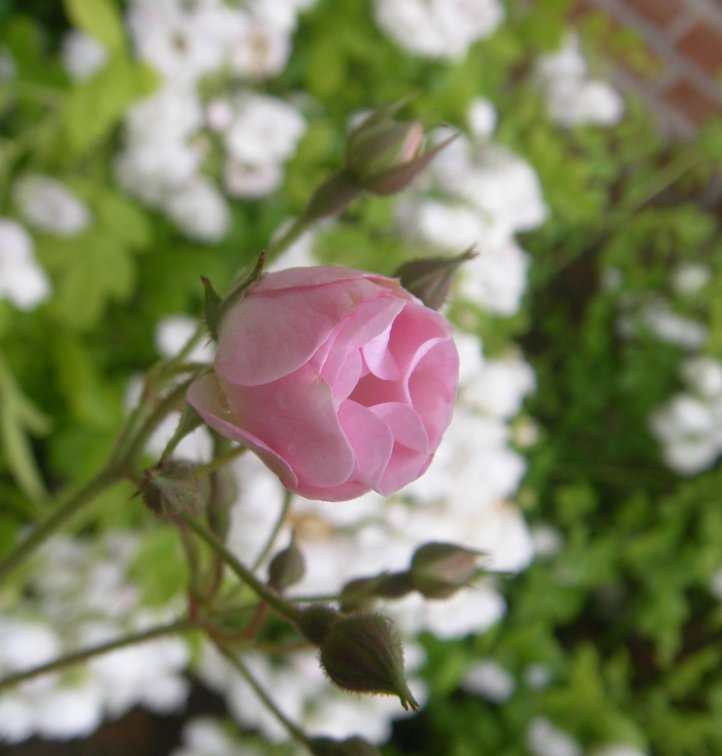 Und noch ein hübsches Foto von Rosa arvensis plena und eine Rose, die vor meiner Gartenpforte lag (‘Tuscany’ vermutlich):